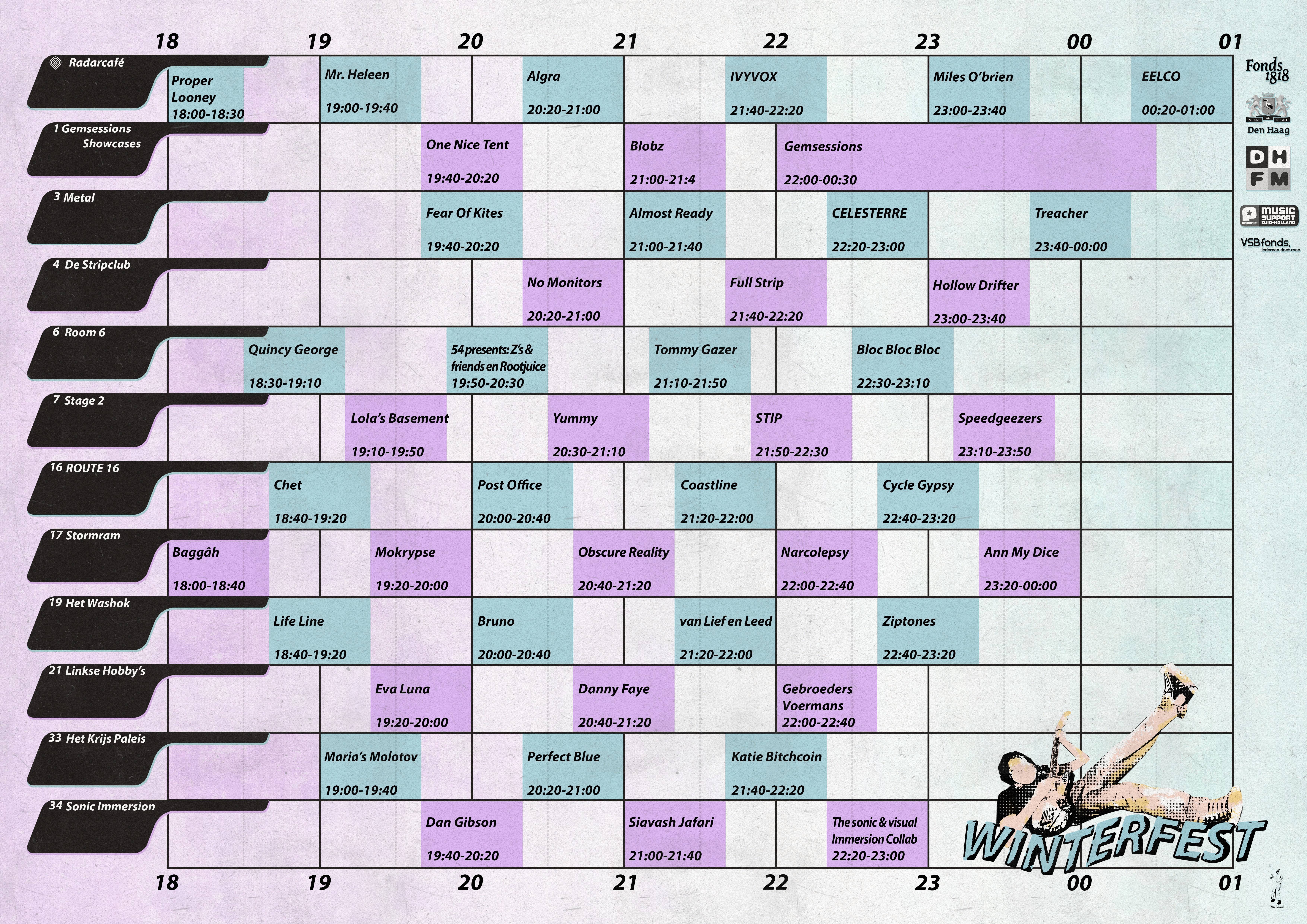 Winterfest! Het showcase festival van Popradar. Op 28 februari gooien we de deuren van oefenruimtes wijd open en kan jij ervaren wat Popradar en de lokale Haagse scene allemaal te bieden heeft! Met meer dan 40 acts, verdeeld over 12 ruimtes is er genoeg te beleven voor liefhebbers van rock, metal, hiphop, punk, indie en folk.